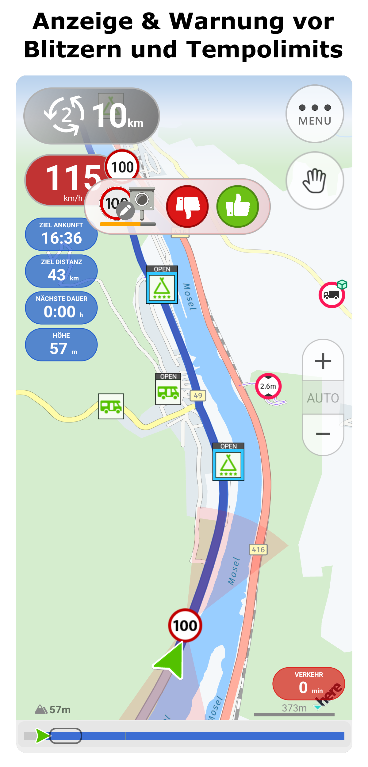 • Anzeige und Warnung vor Tempolimits