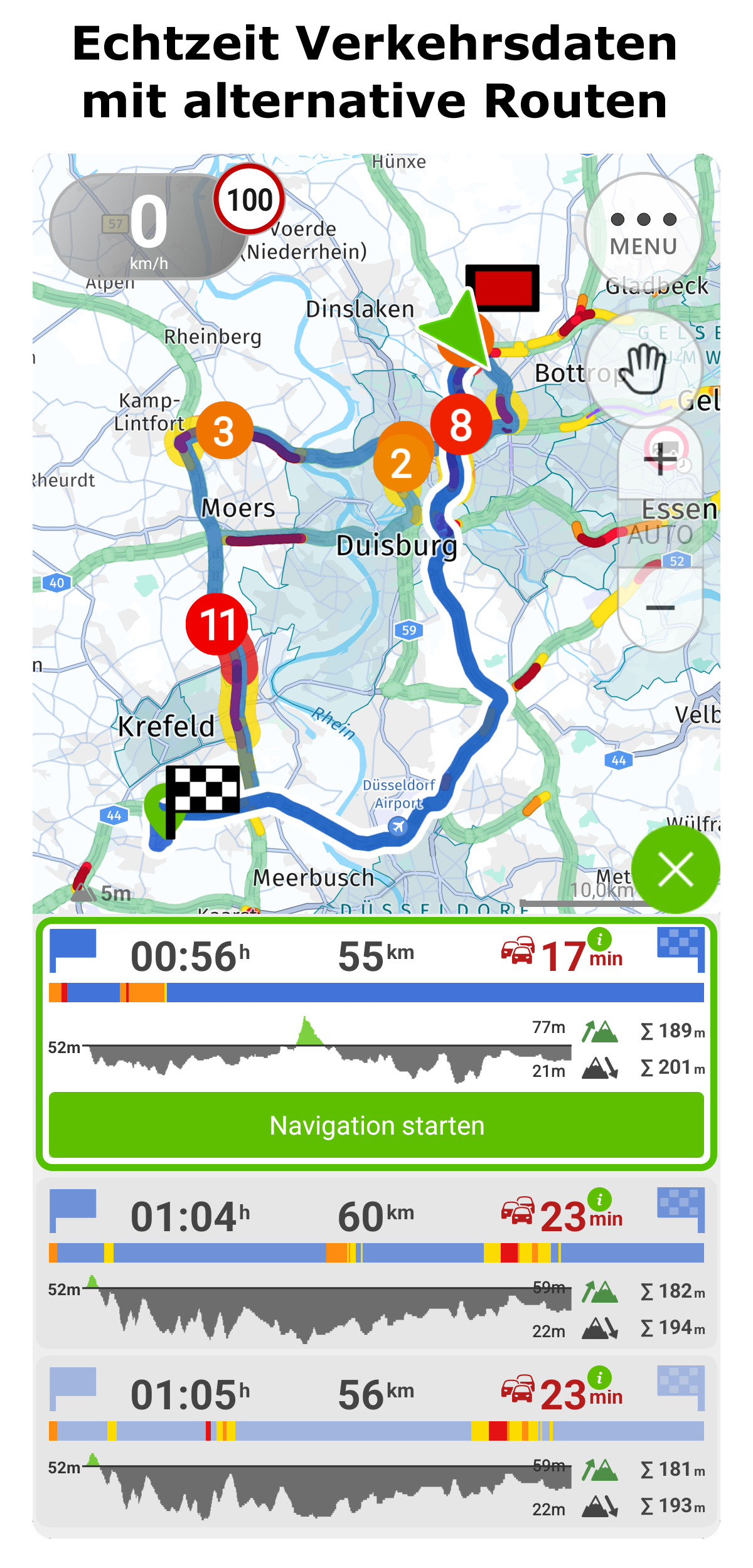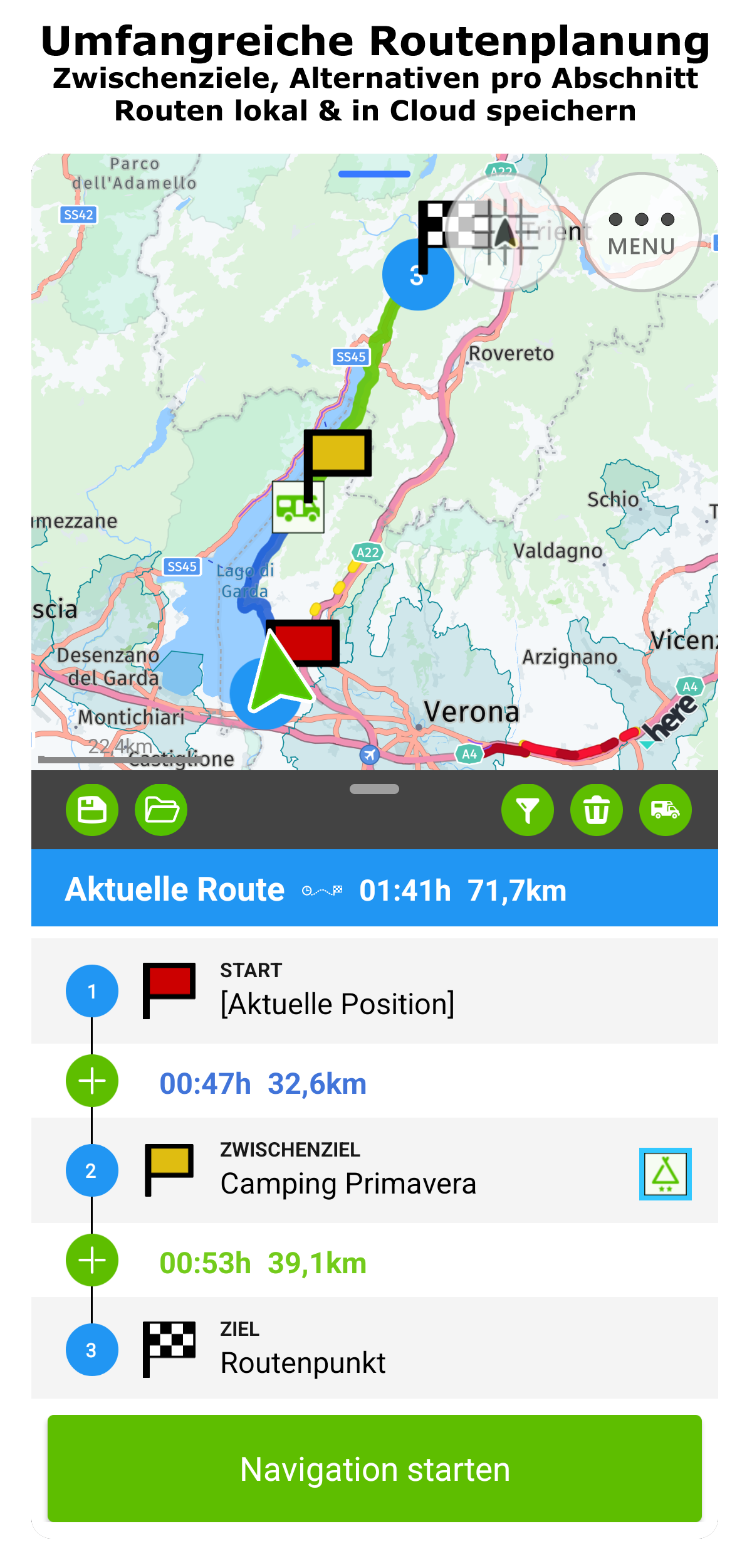 • Routenberechnung inkl. Alternativrouten und automatischem ReRouting