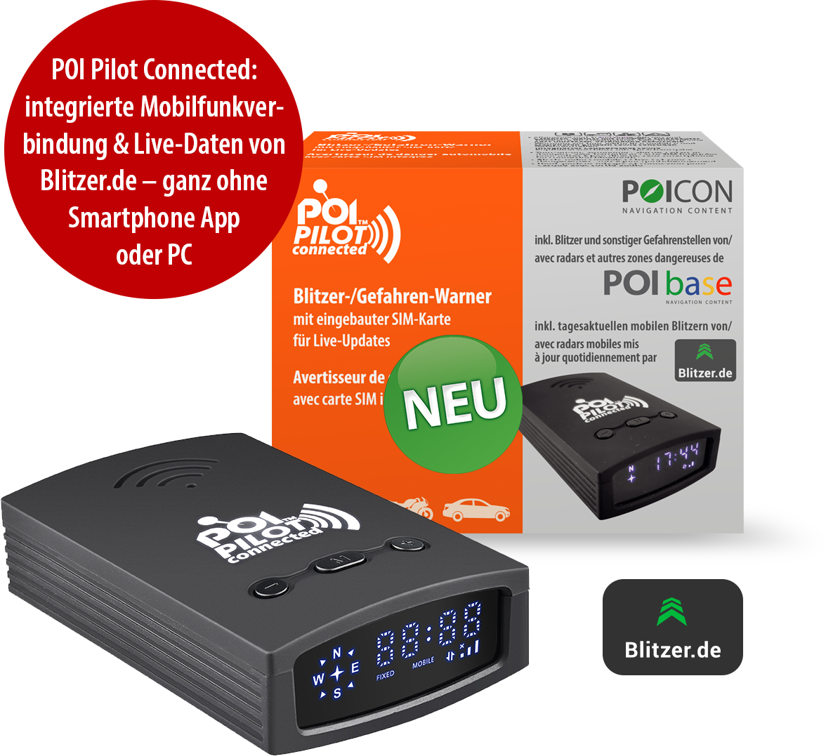 Pas de GPS compatible ? Le tout nouveau POI Pilot connected avec carte SIM intégrée n'a jamais été aussi simple et aussi bon ! Maintenant avec les données en temps réel de blitzer.de et les radars pour l'Europe de POIbase !