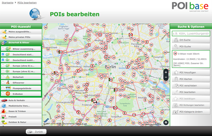 Use the free POIbase software for Windows to add speed cams and other POIs to almost any mobile navigation device and built-in system from practically every manufacturer in just a few steps. Using an interactive map, own POIs can be created, edited and shared with the POI community.